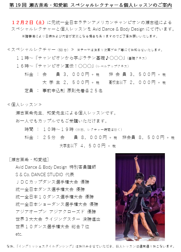 なお、Avid Dance & Body Designの会員かどうか、アマチュアかプロフェッショナルか、競技選手かそうでないか、ラテンダンスの経験などは一切問いませんので、「瀬古先生のレクチャーを聞きたい!」、「全日本チャンピオンのレッスンを受けたい!」などと思われる方はどなたでも気軽にお申し込みください(^-^)